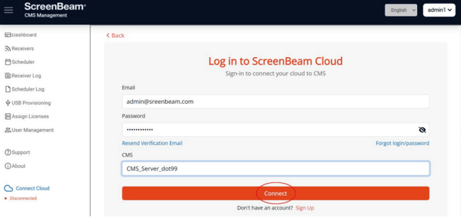 Enter the credentials to the ScreenBeam Cloud login page and provide a friendly name for the CMS.